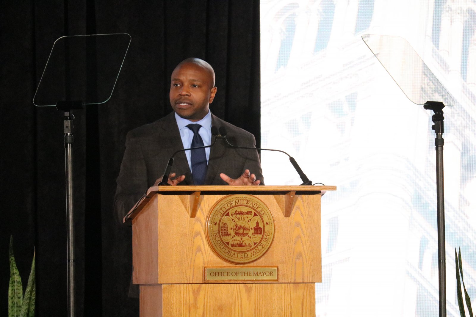 Mayor Cavalier Johnson delivers the 2026 State of the City address. Photo by Sophie Bolich.