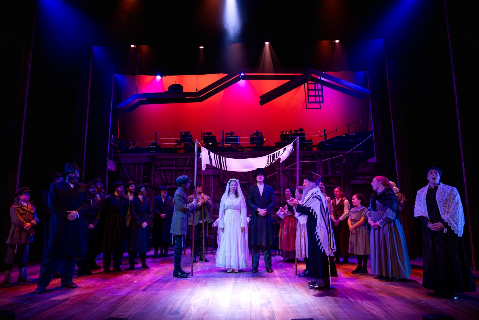 (I. to r.) Andrew Varela (Tevye), Erin Fricker (Tzeitel), Grayson Buesing (Motel), John Schneider (Rabbi), Janet Metz (Golde), and cast in Skylight Music Theatre’s production of Fiddler on the Roof running October 3-26, 2025. Photo by Mark Frohna.