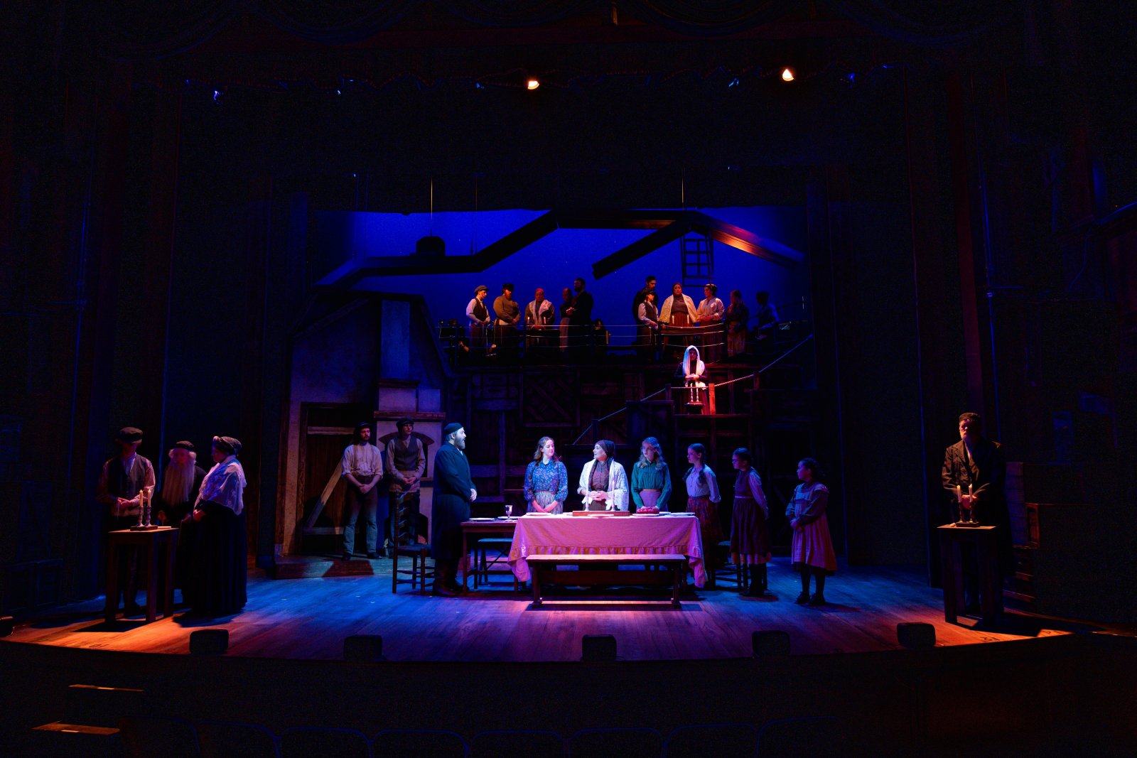(I. to r.) Andrew Varela (Tevye), Erin Fricker (Tzeitel), Janet Metz (Golde), Kynkade McLachlan (Hodel), Naomi Kriege (Chava), Allyson Lindberg (Shprintze), Allyson Lindberg (Shprintze), and cast of Skylight Music Theatre’s production of Fiddler on the Roof running October 3-26, 2025.