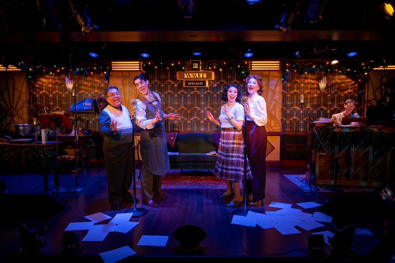 Milwaukee Repertory Theater presents It’s A Wonderful Life: A Live Radio Play in the Stackner Cabaret October 31 – December 21, 2025. Pictured L to R: David Flores, Daniel Arana, Eva Nimmer, Melinda Parrett and Wade Elkins