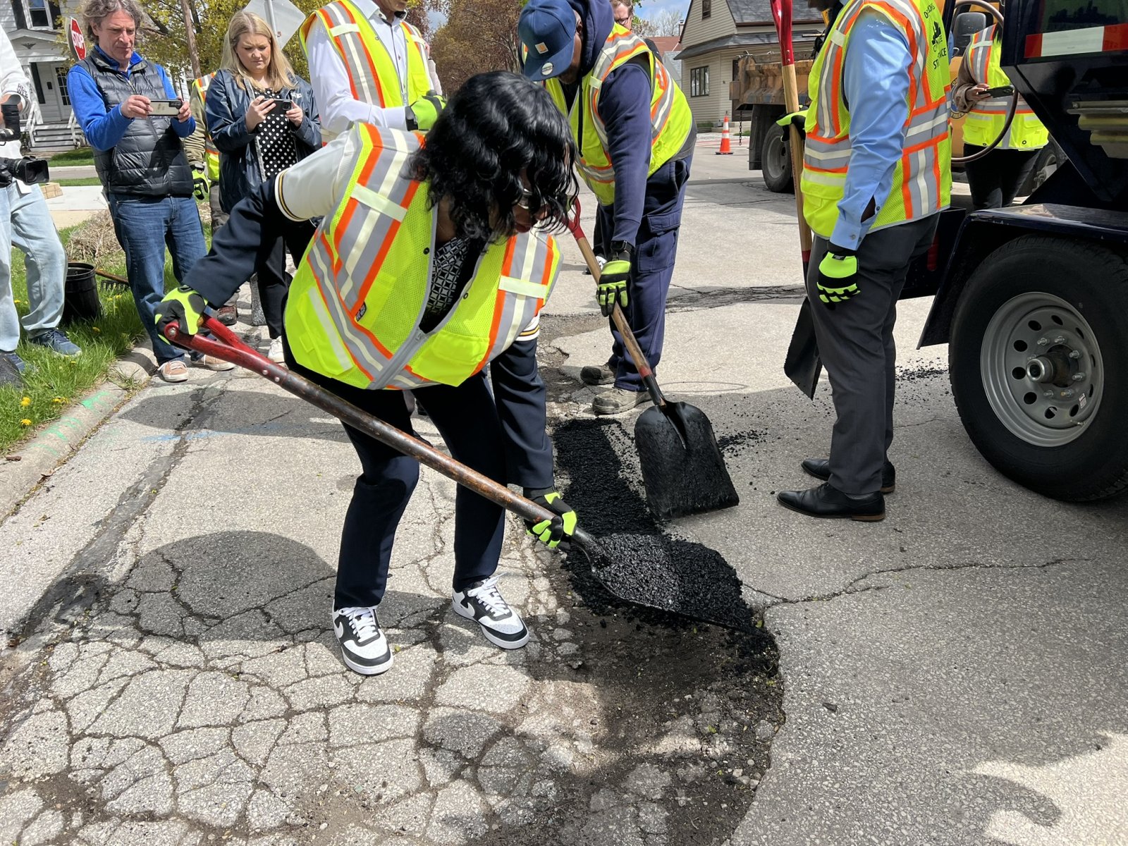 Alderwoman Sharlen P. Moore Fills a Pothole Photo taken April 28, 2026 by Jeramey Jannene. All Rights Reserved.