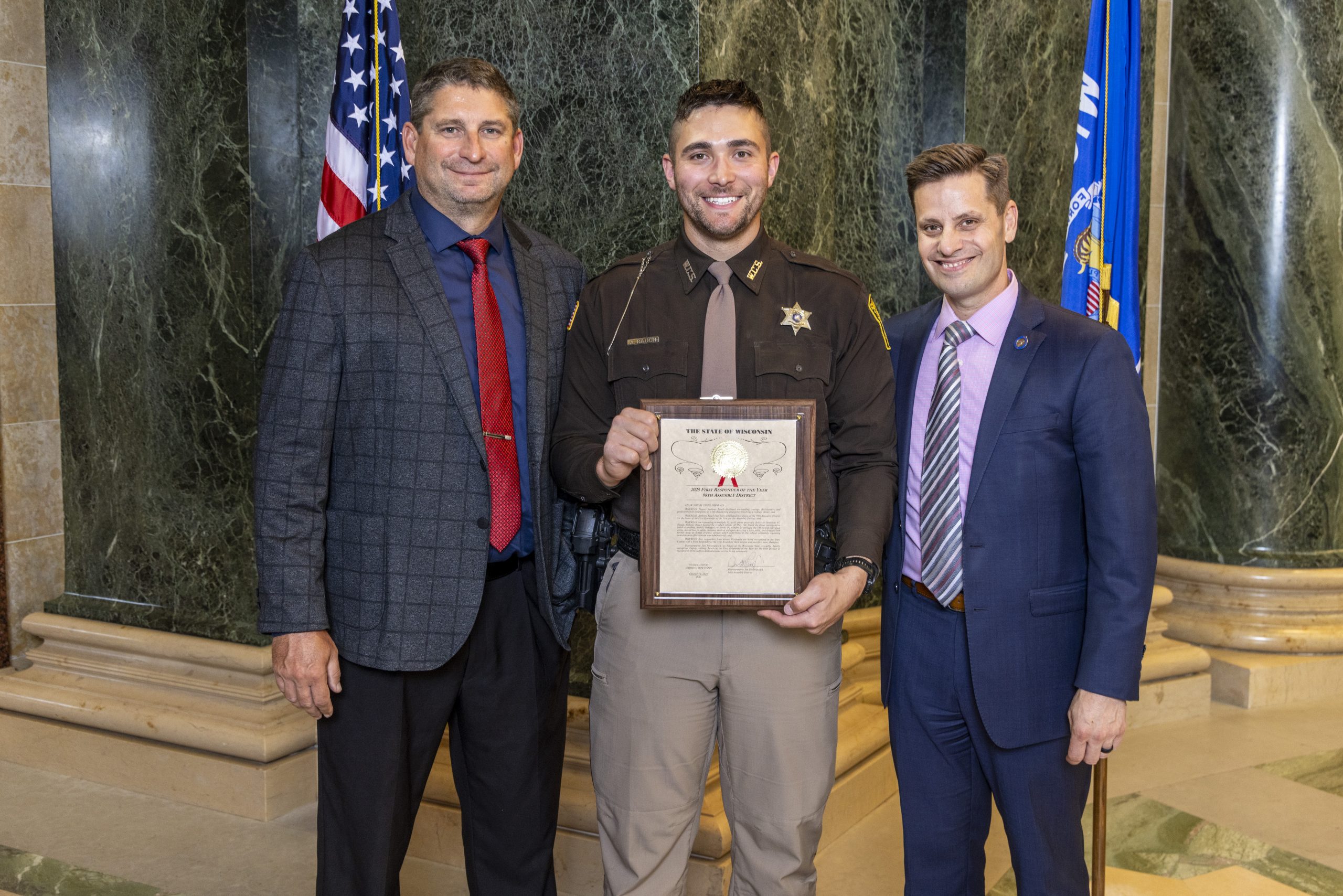 Madison – Yesterday, State Representative Jim Piwowarczyk presented Officer Deputy Anthony Rauch of the Washington County Sheriff’s Department with the 2025 First Responder of the Year Award for the 98th Assembly District.