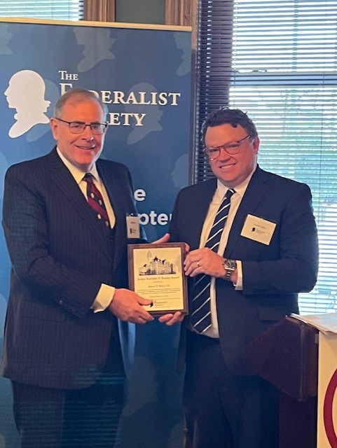 MILWAUKEE, December 15, 2025 – James T. Barry III has been awarded the Judge Rudolph T. Randa Award by the Milwaukee Lawyers Chapter of the Federalist Society for Law and Public Policy. The Rudolph T. Randa Award is conferred annually upon a recipient who exhibits “devoted service in upholding the rule of law, preserving the Constitution of the United States, and defending the proper role of the judiciary in our governmental system.” The award is named after deceased Judge Rudolph T. Randa, who served on the United States District Court for the Eastern District of Wisconsin for many years and served on the Board of Advisers of the Milwaukee Lawyers Chapter of the Federalist Society. The award was presented to Mr. Barry at a luncheon held at the Milwaukee Club on December 10, 2025.