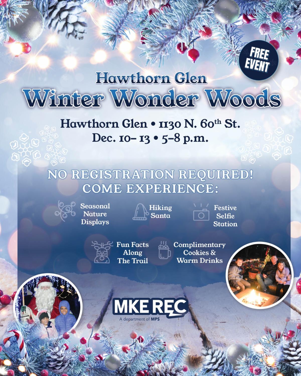 This year, Milwaukee Recreation is offering the Winter Wonder Woods experience to all community members for free. Community members no longer have to register for a time slot and attend during a specific window of time. Participants may enjoy the experience and enter and exit Hawthorn Glen as they please. More information can be found at mkerec.net/wonderwoods.