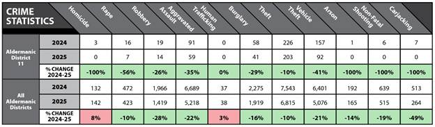 “Public safety is not improved by chance,” said Alderman Peter Burgelis. “These results reflect sustained coordination between residents, law enforcement, city departments, and community partners. While there is still work to do, District 11 is clearly moving in the right direction.”